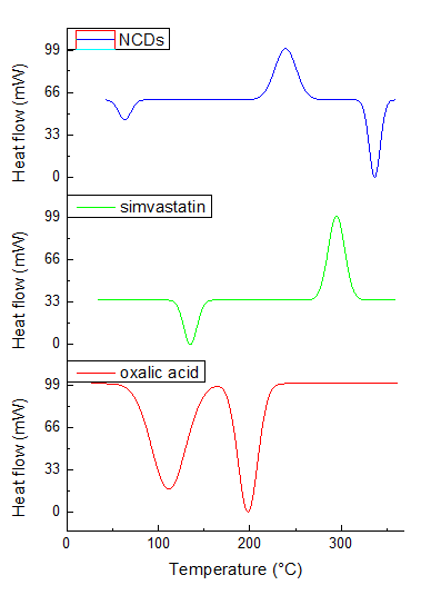 The standard simvastatin thermogram shows an endothermic peak, which is the melting process of crystal solids with an onset temperature of 120.8 °C, maximum peak at 134.3 °C and enthalpy of-105.68 J/g. The oxalic acid thermogram showed an endothermic peak with an onset temperature of 68.8 °C, maximum peak at 111.2 °C and enthalpy of-689.77 J/g. The co-crystal thermogram shows an endothermic peak with an onset temperature of 48.0 °C, maximum peak at 62.9 °C and enthalpy of-232.35 J/g. Changes in the values of the maximum onset, peak temperatures and enthalpy values show the different characteristics of standard simvastatin, co-former oxalic acid and the resulting NCDs. It appears that there is a decrease in the value of the onset temperature, the maximum peak and the enthalpy value, indicating that NCDs require less heat than the standard simvastatin (1).