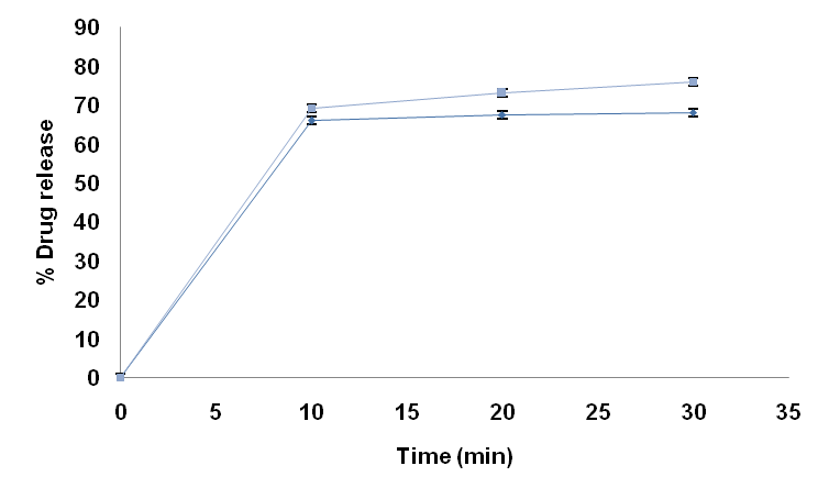 The dissolution rate test was conducted based on USP30-NF25 using Apparatus 2 (paddle) with a speed of 50 rpm for 30 min and 900 ml media buffer solution pH 7 at 37±0.2 °C. Periodically every 10 min, 5 ml was sampled and the media replaced with the same volume during the test. Samples were then measured using UV spectrophotometry in the wavelength range of 247–257 nm to calculate the dissolution rate [6].