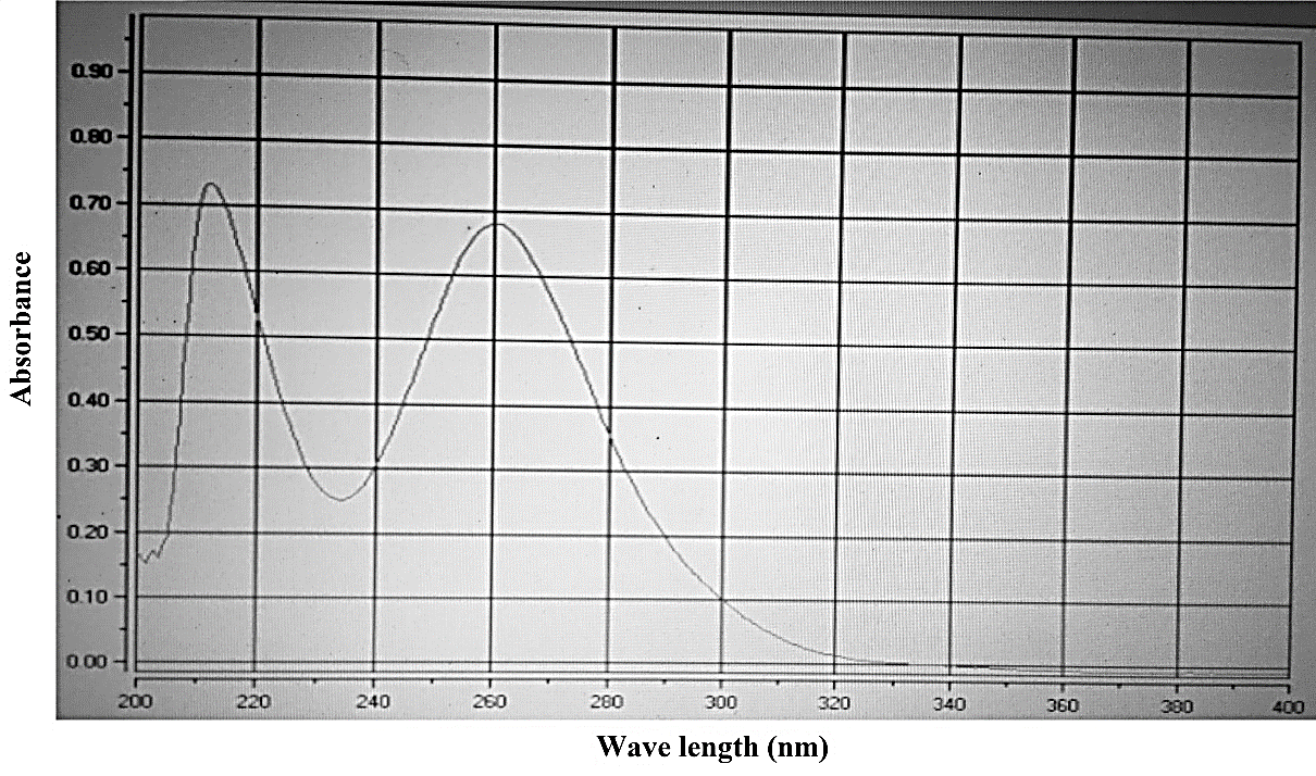 A solution of 15 µg/ml of ketoprofen at pH = 7.4 was noted, then it was examined by a UV-Visible spectrophotometer from (200-400) nm, and the λmax was recorded. The λmax of ketoprofen is shown in fig. 2 [16].