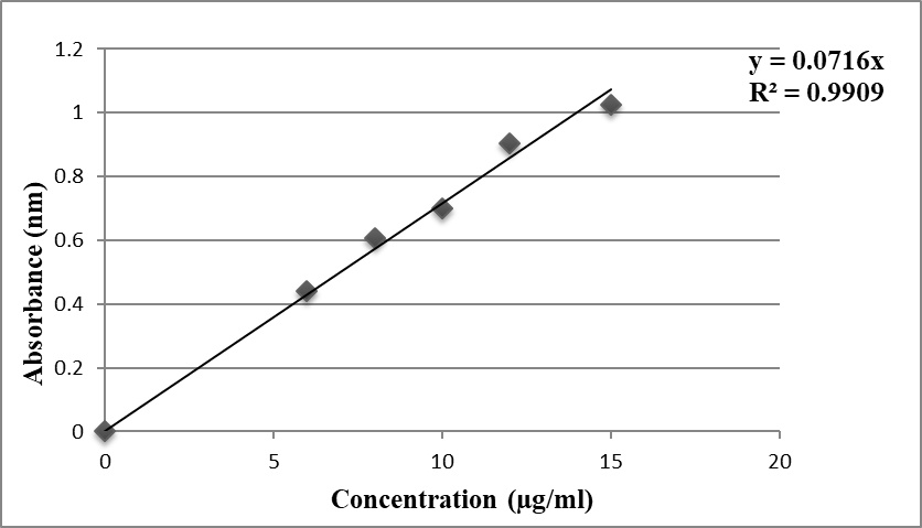 Calibration curve of ketoprofen (pH = 7.4) was constructed by preparing serial dilutions of the drug from a stock solution (40 µg/ml). Samples were analysed spectrophotometrically at the detected λmax of ketoprofen. The determined absorbance was recorded and plotted versus the concentration (µg/ml). Calibration curve of ketoprofen is shown in fig. 3 [17].