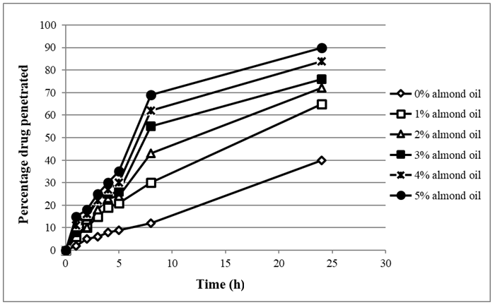 Results: There was a strong positive correlation between % of incorporated almond oil and the % of drug released when the samples were compared with F1 that was formulated without almond oil. After 24 h, 90% of medication was penetrated from ketoprofen hydrogel formulation (F6), which had 5% almond oil.