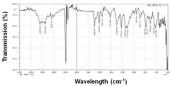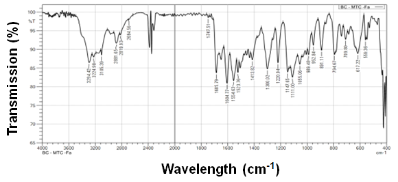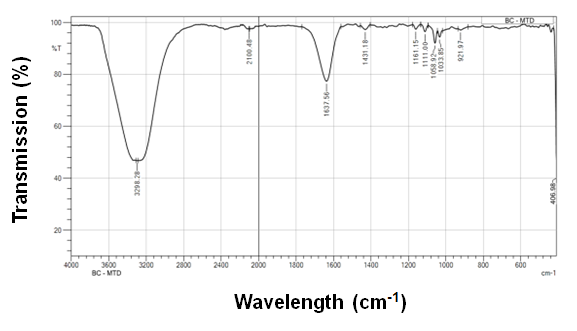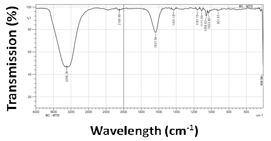 The FTIR spectra of 3DNCs (3DNC-SM, 3DNC-CW, 3DNC-RW) in fig. 4-6 displayed the typical features of cellulosic substrates with intense bands around 3300, 2880, 1100 and 700 cm-1, associated with the vibrations of the–OH, C–H, C–O–C and–CH2–groups, respectively [2, 11, 20]. FTIR spectra of the famotidine in fig. 3 showed that the famotidine exhibited various peaks due to the presence of specific functional groups. It is demonstrated that the peaks of the major functional groups of the famotidine were obtained at 1284, 1535, 3101 and 3394 [11].