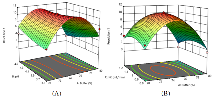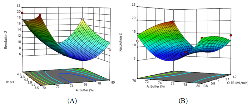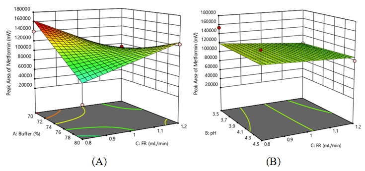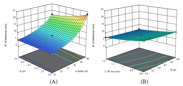 Fig. 2: The 3D surface graph of interaction between %buffer (X1) and pH (X2) (A); between pH (X2) and flow rate (X3) (B) on retention time of metformin (Y1)