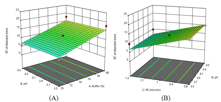 Fig. 3: The 3D surface graph of interaction between %buffer (X1) and pH (X2) (A); between pH (X2) and flow rate (X3) (B) on retention time of atenolol (Y2)