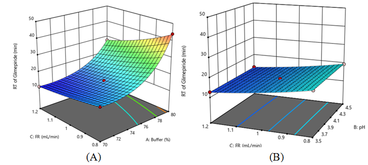 Fig. 4: The 3D surface graph of interaction between %buffer (X1) and flow rate (X3) (A); between pH (X2) and flow rate (X3) (B) on retention time of glimepiride (Y3)