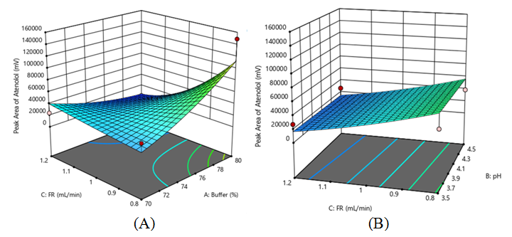 Fig. 6: The 3D surface graph of interaction between %buffer (X1) and flow rate (X3) (A); between pH (X2) and flow rate (X3) (B) on the peak area of atenolol (Y5)