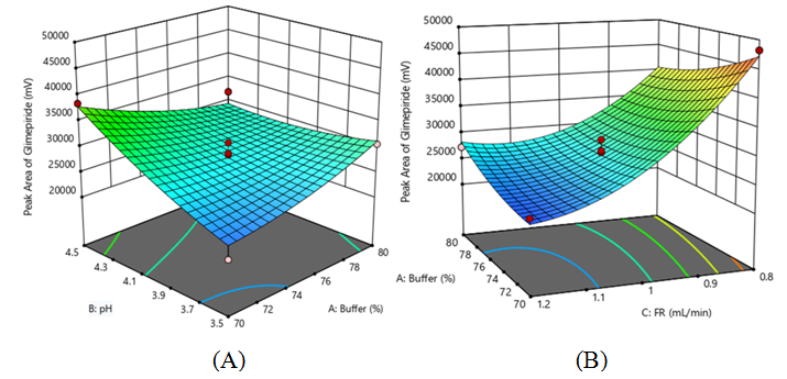 Fig. 7: The 3D surface graph of interaction between %buffer (X1) and pH (X2) (A); between %buffer (X1) and flow rate (X3) (B) on the peak area of glimepiride (Y6)