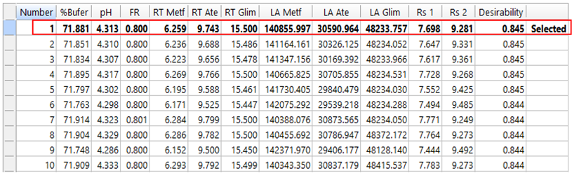 The optimization of HPLC condition was conducted by the experimental design approach, Box-Behnken Design (BBD) using Design-Expert 11.0 software. In the preliminary study, the mobile phase used was a mixture of acetonitrile-phosphate buffer 0.0125 M+SDS 1 mmol pH 4.00 (25:75) with a flow rate 1.0 ml/min. The independent variables in this study were the percentage of buffer composition in the mobile phase (X1) that optimized at 70-80%, pH of mobile phase (X2) was optimized at 3.5-4.5, and flow rate (X3) was optimized at 0.8-1.2 ml/min. The responses as dependent variables were retention time, peak area, and resolution.