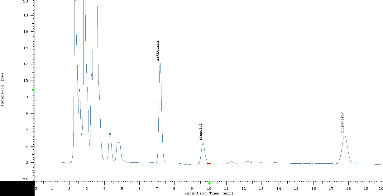 The predicted optimum condition was comprised of phosphate buffer at 72%, pH at 4.3 with flow rate of 0.8 ml/min. Fig. 11 showed chromatograph of metformin, atenolol and glimepiride produced using the optimum condition on plasma sample. It can be seen that the duration time of analysis was too long. Therefore, the flow rate was increased to 1.0 ml/min to shorten duration of the analysis. As shown on fig. 12, by using flow rate at 1.0 ml/min, the retention time of glimepiride became 14 min, shorter than it from initial method using 0.8 ml/min. And under these conditions, there was also did not find interfering peaks from the matrix. This condition was then chosen for system suitability test and validation method.