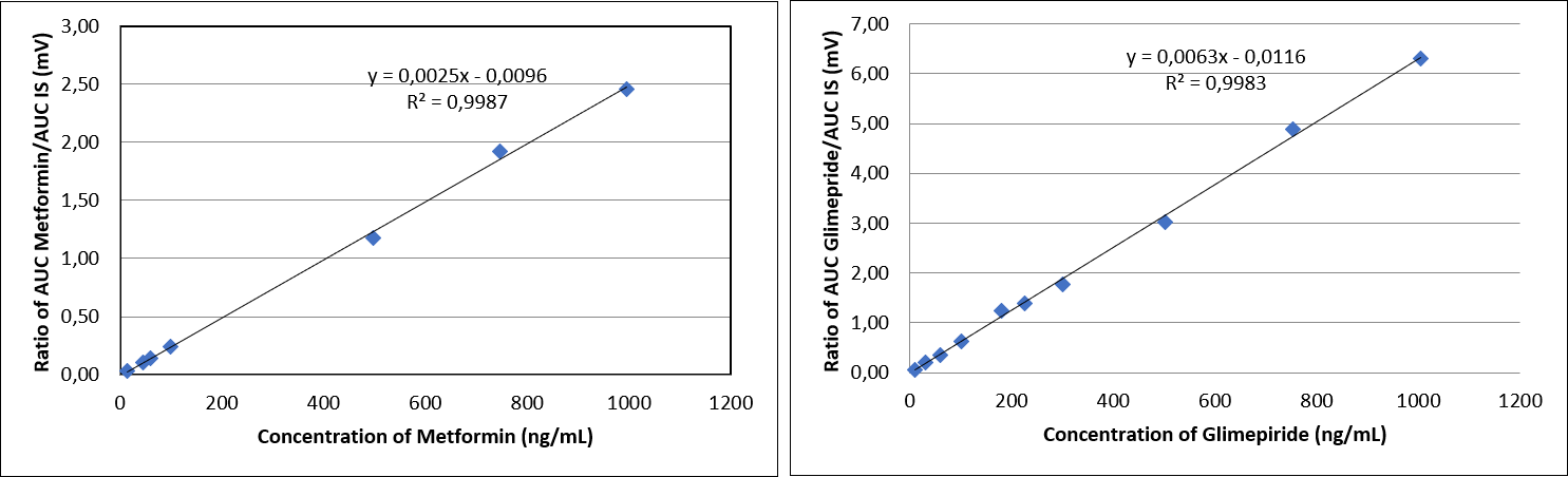 | Linear range | Metformin: 15-1000 ng/ml Glimepiride: 10-1000 ng/ml |