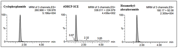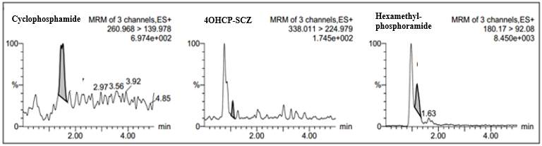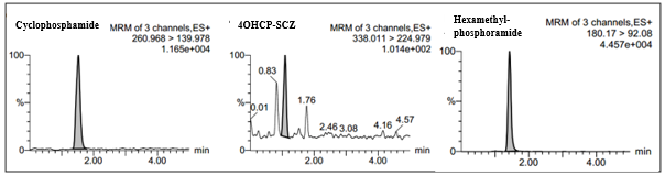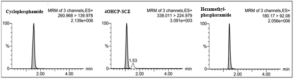 Mass detection was carried out using a positive Electrospray Ionization (ESI). Positive ESI mode is used because analyte can be protonated. Cyclophosphamide produces a parent ion with m/z 260.968, molecular formula C7H16Cl2N2O2P+and daughter ion with m/z 139.978, molecular formula C4H8Cl2N+. In addition, the semicarbazone 4-OHCP-d4 derivative produces a parent ion with m/z 338.011, molecular formula C8H14D4Cl2N5O3P+and daughter ion with m/z 224.979, molecular formula C4H6D4Cl2N2O2P+. HMP produced parent ion with m/z 180.17, molecular formula C6H19N3OP+and daughter ion with m/z 92.08, molecular formula C2H7NOP+. Acquity UPLC BEH C18 column and VanguardTM Acquity BEH precolom was used for analysis. The mobile phase used was 0.01% formic acid-methanol (50:50) with isocratic elution for 4 min, a flow rate of 0.3 ml/min, and a column temperature of 30 °C [5].