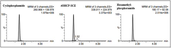 The UPLC-MS/MS system consisted of a binary pump, autosampler, C18 Acquity BEH column (1.7 μm, 100 mm × 2.1 mm, Waters, Milford, MA, USA) using Van Guard TM BEH 1.7 μm precolumn, and mass spectrometry type quadrupole (Xevo TQD, Waters). The separation was performed using a mobile phase of 0.01% formic acid in water-methanol (50:50, v/v) with isocratic elution mode at 0.3 ml/min for 4 min, column temperature of 30 °C, and an ionization method of ESI+. The quantitation was conducted using multiple reaction monitoring (MRM) and the quantitation traces were 260.968>139.976 for cyclophosphamide, 338.011>224.979 for 4-OHCP-semicarbazide (4-OHCP-SCZ), and 180.17>92.08 for HMP. The injection volume was 10 μl.
