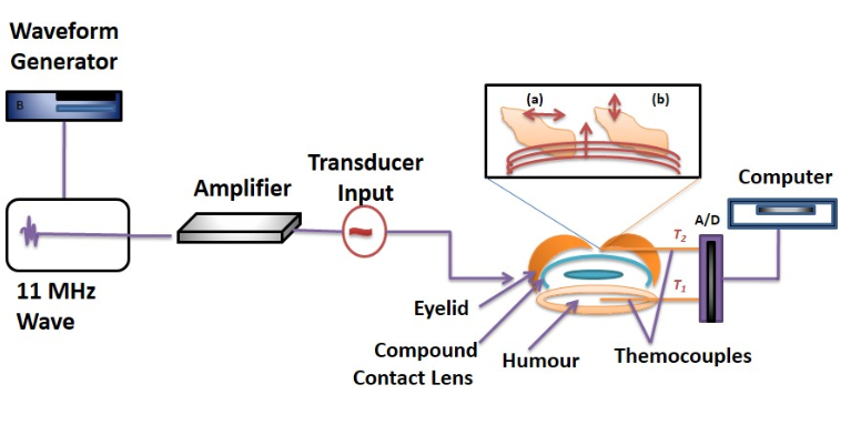 The contact lens is embedded with piezo-electric transducers where an air gap is present internally. The air gap helps in providing the transducers with air backing. The transducers are fixed reflexively onto the posterior tarsal face. The acoustic waves gets reflected towards tarsus and then reflected away from cornea which prevents the cornea from heating due to direct application of ultrasound [44]. A recent in vivo study was conducted on porcine subject where an equilibrium rise in temperature (5 ° C to 8 °C) was observed in 10 to 15 min. It was also found that the perfusion rate of blood reduced with time. Not more than 2 °C rise was seen in the corneal temperature. No evidence of corneal damage was found in the experiments.