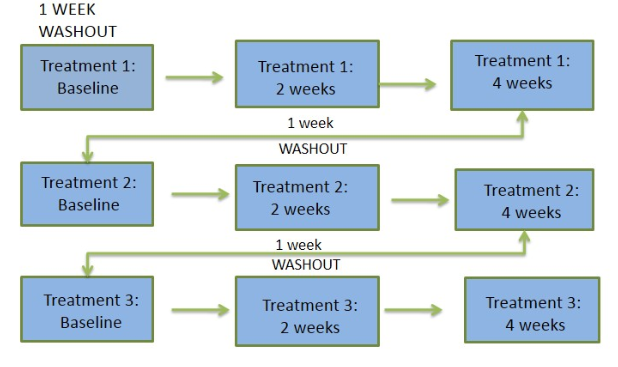 Fig. 4: Repeated measures study design. Each subject completed this program of visits with a 1 w washout duration before starting treatment 1 and a 1 w washout between treatments