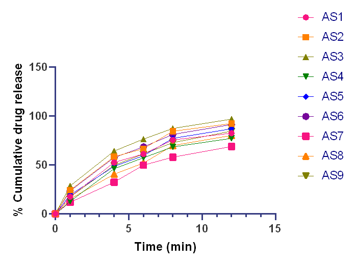 Tables 5 and 6 provide the wetting time and disintegration time for formulations AS1 to AS9, which demonstrates that tablets dissolve quickly. To ensure the moisture sorption and water uptake capabilities of super disintegrants, a water absorption ratio was carried out. Table 6 lists the medication concentration and water absorption ratio for formulations AS1 to AS9. The formulation AS6 with a Crospovidone concentration of 30 mg displays the fastest disintegration time. Drug concentration was determined from the standard calibration curve and expressed as the cumulative percent of the drug dissolved in the formulations used in the in vitro drug release tests shown in fig. 5. Crosspovidone (CP) concentration was inversely related to tablet dissolving time. Variable CP concentrations were utilized to shorten the time. Drug release at low CP concentration was reported to be 91.30% after 12 min. As a result, it was discovered that the time for drug release decreased by up to 5 min from 12 min as the concentration of CP was increased from 20 to 30 mg. The in vitro drug release of formulation AS6, which contains a 30 mg concentration of crospovidone, shows a respective drug release rate of 81.20% after 8 min. Thus, it was determined that higher Crospovidone concentrations result in improved medication release. Better medication release was achieved with the AS6 formulation.