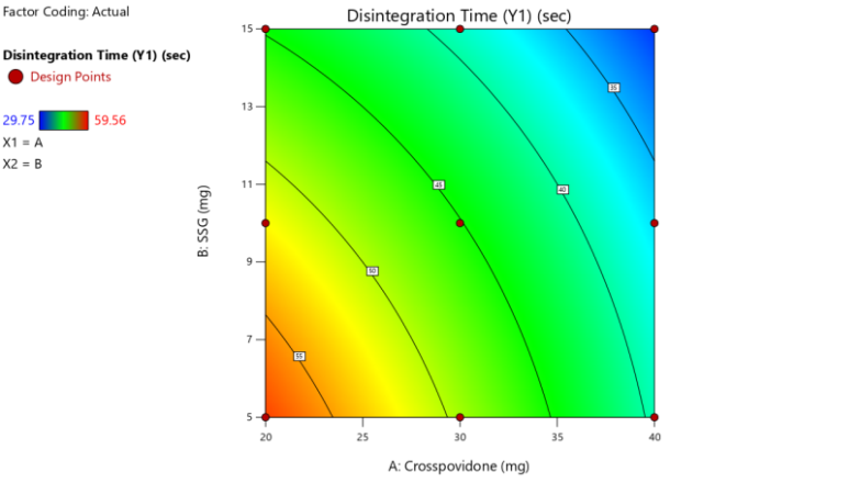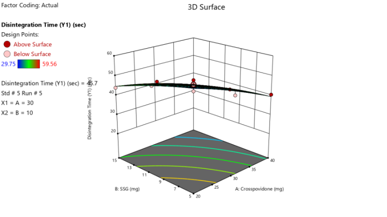 Disintegration Time (Y1) =+45.13-7.88*A-5.26*B+1.2*AB-0.8483*A²-0.9733*B²