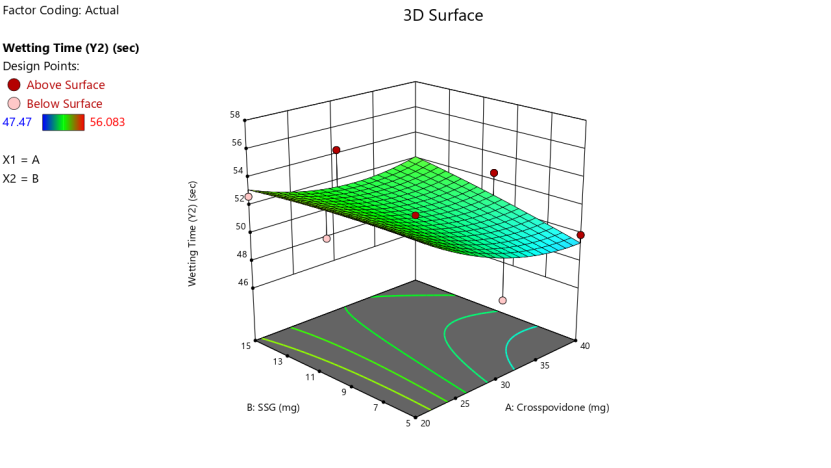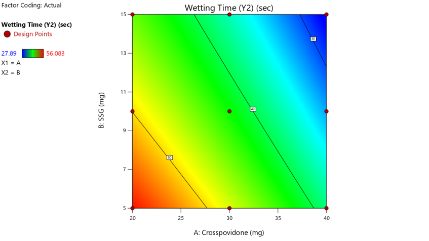 Wetting Time (Y2) =+71.739-0.30155 *Crosspovidone-1.28773 *SSG-0.00315 *Crosspovidone * SSG-0.008915 *Crosspovidone²+ 0.01314*SSG²