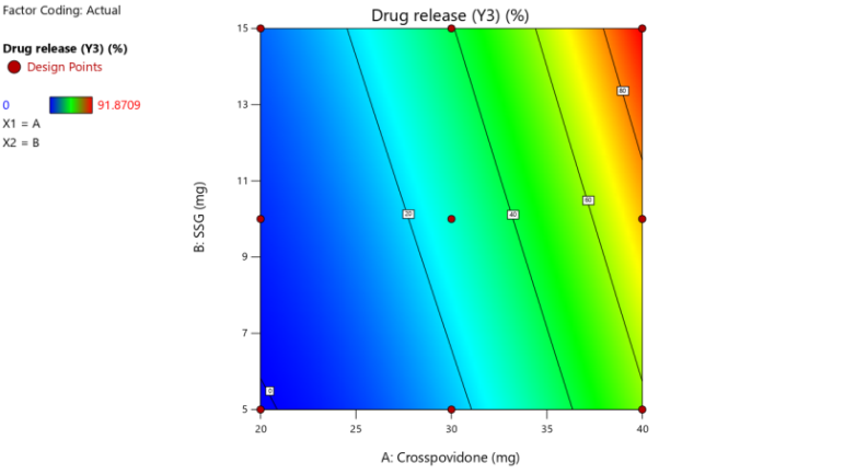 Drug release (Y3) =+27.35+35.42*A+11.26*B+6.34*AB+11.67*A²+0.7315*B²