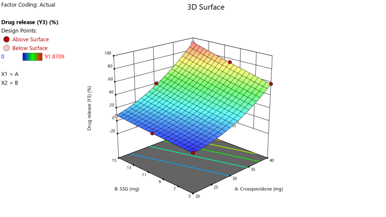 Disintegration Time (Y1) =+74.993-0.52 *Crosspovidone-0.994 *SSG+0.0240* Crosspovidone *SSG-0.008483 *Crosspovidone²-0.038933*SSG²