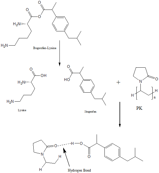 Fig. 1, drawn with Chem Draw software, shows the proposed hydrogen bonding between the guest and the host compounds. The pKa of ethanol and water is 15.9 and 15.7, respectively. Ethanol depicts the loss of proton from hydroxyl group [22]. Hence we hypothesize that ibuprofen lysine undergoes dissociation in ethanolic solution and forms ibuprofen and lysine. Ibuprofen donates 1 hydrogen and accepts 2 hydrogen. The hydrogen donor count and the hydrogen acceptor count of PK is 0 and 1, respectively. The-H from carboxylic acid functional group (-COOH) of ibuprofen has a potential of forming hydrogen bond with the carbonyl group (-C=O) of PK-25 and PK-30. Ibuprofen acts as the proton donor, whereas PK acts as the proton acceptor. We propose that ibuprofen is linked with PK through hydrogen-bonded supramolecular synthons, namely, acid-carbonyl (an interaction between the carbonyl group (-C=O) of PK and the hydrogen (-H) of the carboxylic acid functional group of ibuprofen).