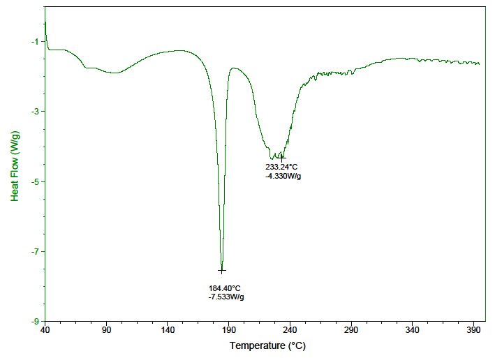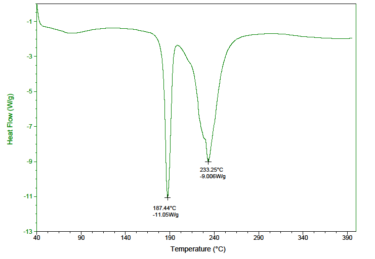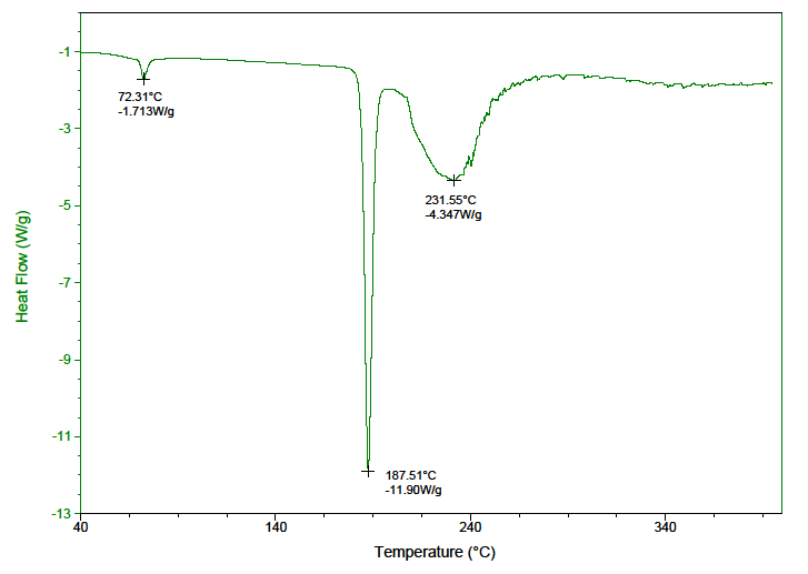Ibuprofen lysine was subjected to thermal screening by DSC. (fig. 5) The DSC thermogram revealed a small endothermic peak at 72.35 ˚C, the sharp endothermic peak at 187.51 ˚C and a broad endotherm at 231.5 ˚C. The first peak may be attributed to a small mass loss from the API sample. The mass loss was associated to vaporization of water from the API sample. The second sharp endotherm indicated a melting point of ibuprofen. The broad endotherm was attributed to the melting and decomposition of lysine.