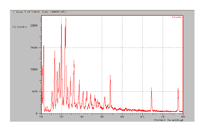 Renato et al. observed the difference between the XRD patterns of ibuprofen-nicotinamide co-crystals and ibuprofen/nicotinamide. The diffraction lines of the co-crystals A5 and B8 were considerably different from the peak positions of ibuprofen and the co-former [19]. (fig. 13 and 14) A prominent peak, at 2˚θ= 10.86 and 10.58, along with the appearance of numerous peaks, confirmed the formation of new crystalline structure. The peaks indicated the crystal lattice arrangement between ibuprofen and the co-formers to some extent. The inability of completion of crystal lattice rearrangement was due to inadequate drug: co-former stoichiometric ratio.