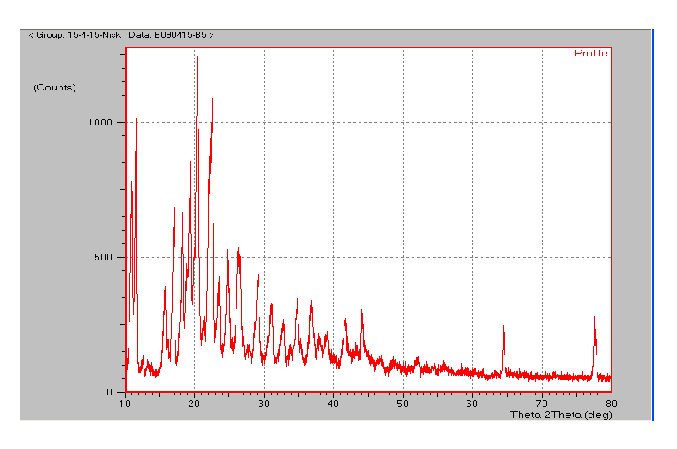 Fig. 10: PXRD patterns of ibuprofen lysine, the PXRD spectra of PK-25 and PK-30 (fig. 11 and 12) revealed diffuse spectra, characteristic of polymeric nature