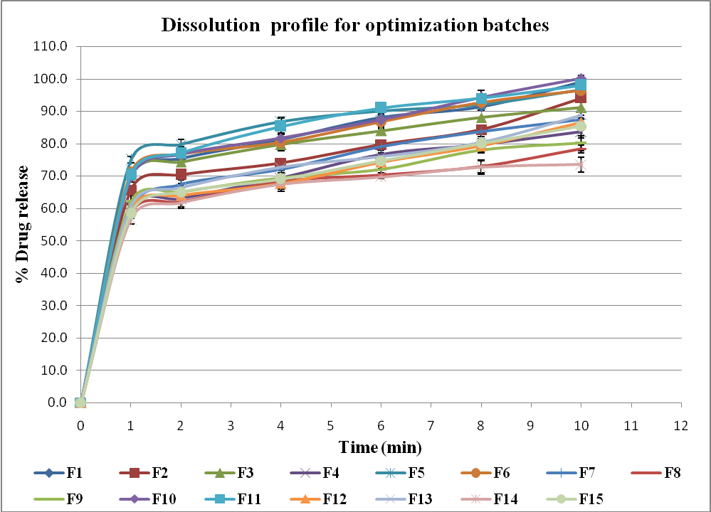 The dissolution study on formulation F1–F15 showed the dissolution ranging 74±2.27 % to 100±1.09 % in 10 min (table 2-4 and fig. 1). High dissolution resulted due to faster breakdown and rapid dispersion of the tablet. It may be due to rapid diffusion or the porous nature of the tablet. The dissolution graphs shown in fig. 1 depict the same. Based on the data, it can be concluded that the addition of super disintegrant improved the dissolution profile of the water-soluble drug besides expediting the disintegration time.
