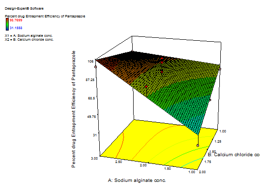 Data from each response is presented in mean±SD (n=3), 3D Surface Response Graph between Sodium alginate (X1), Calcium chloride (X2) with % drug entrapment efficiency of pantoprazole sodium (Y1)