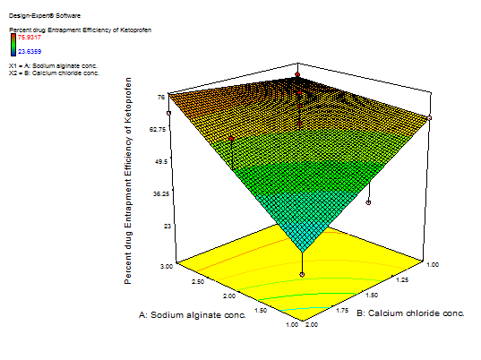 A response surface method 32 factorial designs were applied to evaluate the relationship between the independent variables and their responses. Two variables and one response were involved in the experimental design. The dependent response factor variables measured were entrapment efficiency and % Floating. The independent variables are the concentration of alginate (X1) and the concentration of calcium chloride (X2). The formulation variables and the high and low levels of each variable were defined based on preliminary experiments. Center points were repeated three times to estimate the experimental error. The independent and dependent variables are shown in table and process variables and their levels for full-factorial design are given in table.