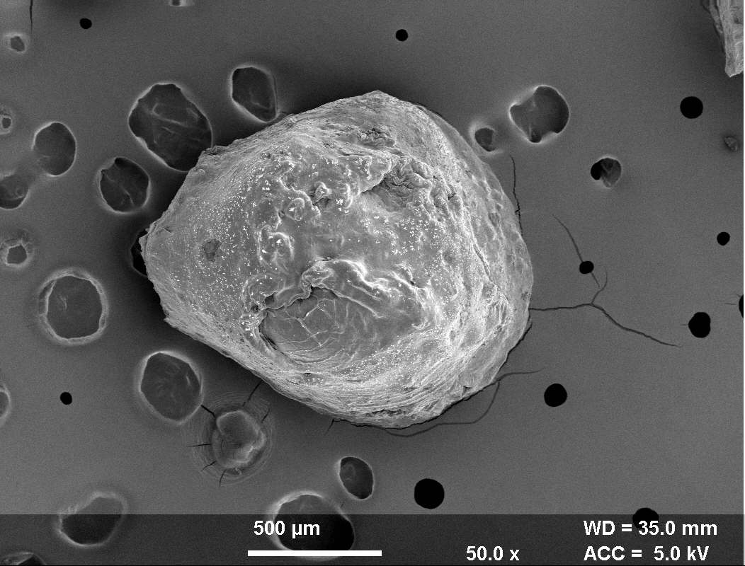The samples were coated with a thin gold layer by a sputter coater unit (SPI, sputter, USA). Then, SEM photographs were taken by a scanning electron microscope (Joel JSM 5400LV SEM, Japan) operated at an acceleration voltage of 15 kV[16]. The morphological evaluation of the optimized beads formulation was done by scanning electron microscopy. SEM study revealed that the microspheres were almost spherical in shape with a rough outer surface.