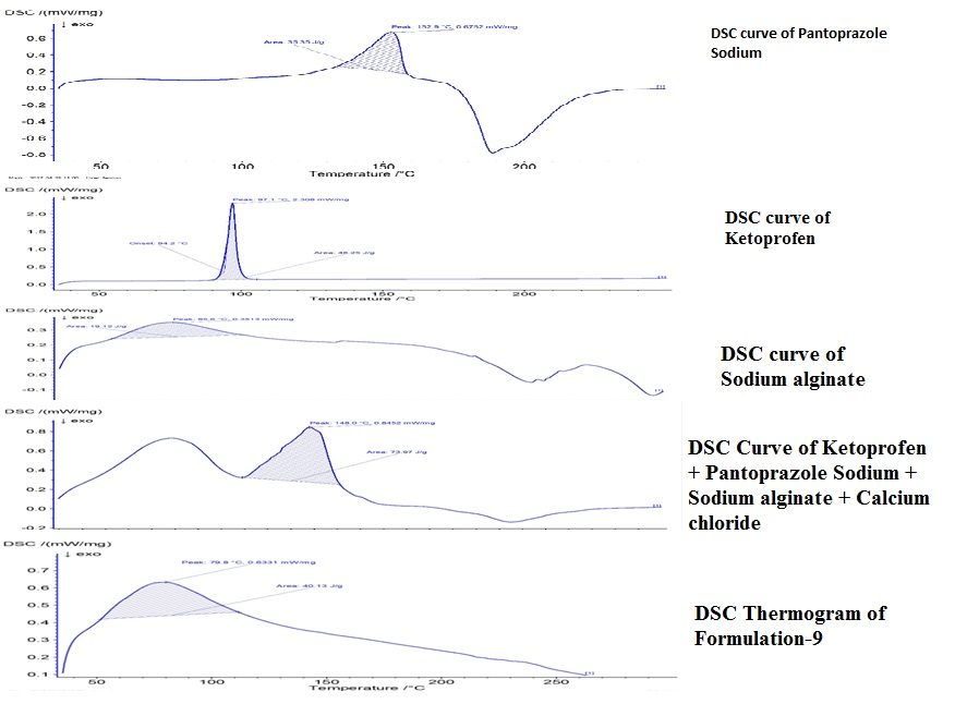 Fig. 1.4: DSC curve of pantoprazole sodium, DSC curve of Ketoprofen, DSC curve of Sodium alginate, DSC curve of Ketoprofen+Pantoprazole Sodium+Sodium Alginate+Calcium chloride, DSC Thermogram of optimized formulation