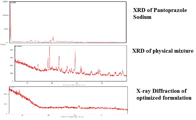 Fig. 1.5: XRD of pantoprazole sodium, XRD of the physical mixture, X-ray diffraction of optimized formulation