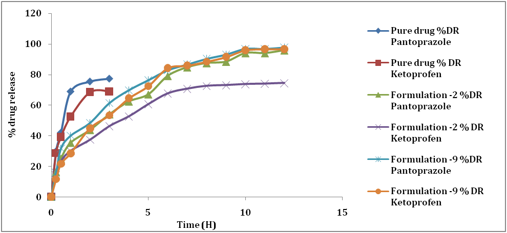 Discussion: Prepared floating beads shows almost spherical in shape with the rough outer surface, but high loaded beads were not smooth as low drug-loaded beads as their surface was covered by drug crystals. Differential Scanning Calorimetry (DSC) therms showed relatively broad melting endothermic peak, indicate that only a small fraction of drugs substance existed in the crystalline state. A small sized particle leads to high surface energy, which creates an energetically suboptimal state causing a decrease in the melting point. X-ray diffraction analysis showed the stable character of drug in the drug-loaded hollow beads and revealed the absence of any drug-polymer interactions. X-ray diffraction (XRD) indicates the amorphous dispersion of the drug after entrapment into microbeads may increase the bioavailability of drugs. The optimized formulation F9 showed 97.74% and 96.57% drug release for Pantoprazole sodium and ketoprofen, respectively, optimized formulation indicated goof floating characteristics. The in vitro dissolution studies of the formulation formulation-9 shows maximum percent cumulative release with in 12 h. This shows that Formulation-9 was having the good sustained release of the Pantoprazole Sodium and Ketoprofen up to the 12 h.