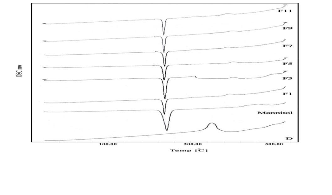 Fig. 1 (a): DSC thermograms of Lornoxicam (D), Mannitol, F1, F3, F5, F7, F9 and F11