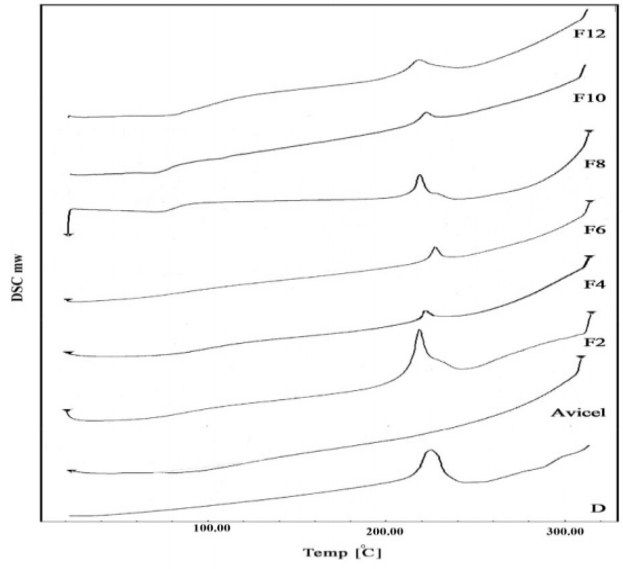 Fig. 1(b): DSC thermograms of Lornoxicam (D), Avicel, F2, F4, F6, F8, F10 and F12