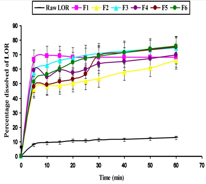 The dissolution experiment of raw lornoxicam (8 mg) and lornoxicam nanoparticle formulae (equivalent to 8 mg of lornoxicam) were carried out using the USP dissolution tester apparatus (II) (Dis 6000, Pharmatron, Switzerland). The stirring speed was 100 (rpm), the temperature was 37.0±0.5 °C and 900 ml of 0.1 N HCl pH 1.2 was used as the dissolution medium. Aliquots of 5 ml were collected after 5, 10, 15, 20, 25, 30, 40, 50 and 60 min and immediately supplemented with the same volume of fresh medium. Finally, the concentrations of the collected aliquots were determined spectrophotometrically against a blank at 372 nm in acidic medium. The experiment was done in triplicate and the mean values of cumulative percentage drug dissolved were plotted versus time [18].