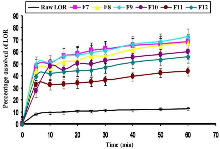 Fig. 6: In vitro dissolution profiles of tablet formulae in gastric simulated fluid at pH 1.2 and 37 °C, (mean±SD, n=3)