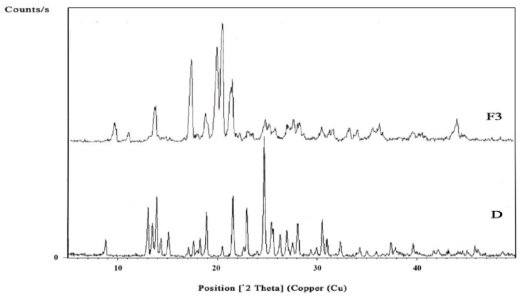 The solid state of raw lornoxicam and the lornoxicam nanoparticles formula of choice were examined using an x-ray diffractometer (Philips, X’Pert Pro, Netherlands) with secondary Monochromator. The current and voltage using Cu-radiation were generated at 35 mA and 45 kV, respectively. The angular range was scanned from 0 ° to 60 ° of 2θ, with a scanning speed 0.02 °/s [21].