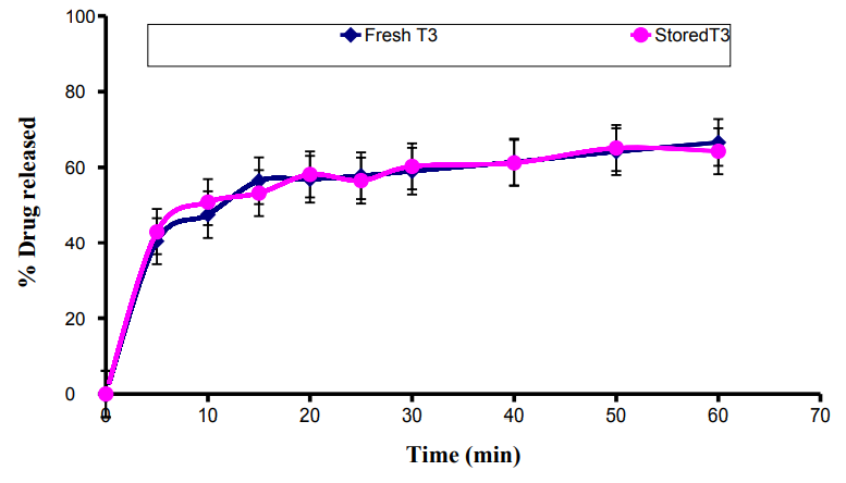 Fig. 8: Comparison between dissolution profiles of T3 in fresh and after 4 w of storage condition, mean of readings (n=3)±SD