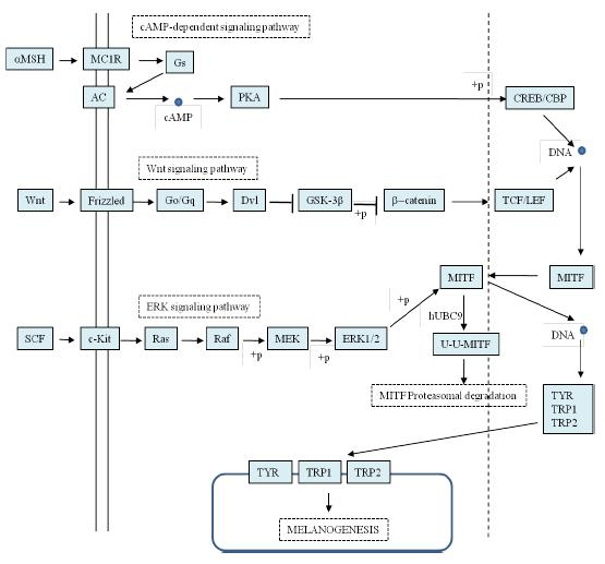 In the opposite of the aforementioned path, the path of an extracellular signal-regulated kinase (ERK) regulates melanogenesis through MITF protein degradation. ERK activates the phosphorylation of MITF through serine 73, followed by MITF ubiquination and proteasome-mediated degradation. As the result, the ERK pathway activation will inhibit melanogenesis, associated with down-regulation of MITF activity [34, 93].