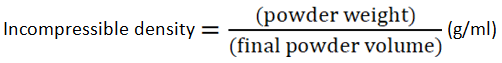 Real density, compressed density, and compressibility: Actual density was determined by placing a number of print masses into a measuring cup and then measuring its volume and calculating its density by the following formula [24].