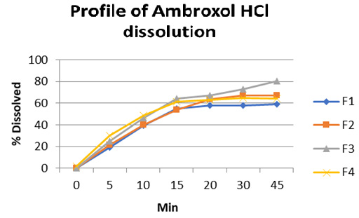 Dissolution profile results from four ambroxol tablet formulas, only formula 3 (F3) fulfilled dissolution requirements according to European Pharmacopoeia, namely within 45 min, Q value of 80.09946%. Formula three has high levels of ambroxol HCl based on assay uniformity test with a value of 108.6641%. This would have an impact on the active substances that would dissolve when dissolved. For formula 1 (F1) which had a Q value of 58.77974%, it did not meet the existing requirements, because, at the time of uniformity testing, the concentration of the active substance ambroxol HCl was only 89.8735%, so it affected the dissolution test. For formula 2 and formula 4 also did not meet the dissolution test requirements, according to European Pharmacopoeia.