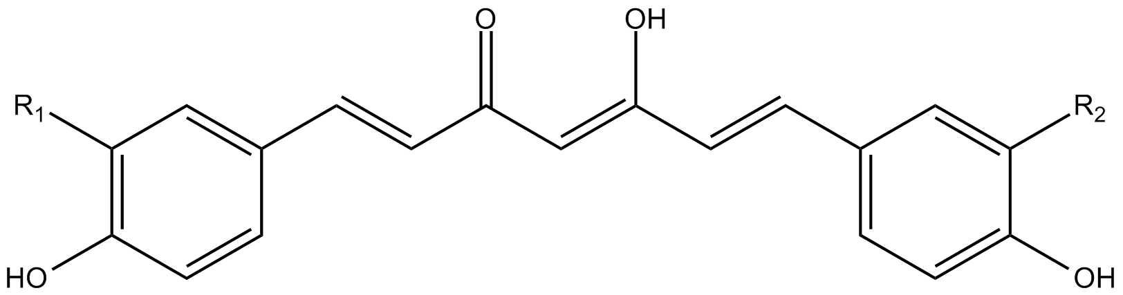 Fig. 1: Chemical structure of curcuminoid curcumin (R1 = OCH3, R2 = OCH3), demethoxycurcumin (R1 = OCH3, R2 = H), and bisdemethoxycurcumin (R1 = H, R2 = H)