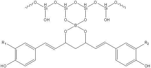 Fig. 4: Molecular structure of (A) silica, (B) hypothesis structure of the bond of boron-silica, and (C) hypothesis structure of the bond of boron-silica and curcuminoid