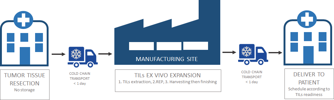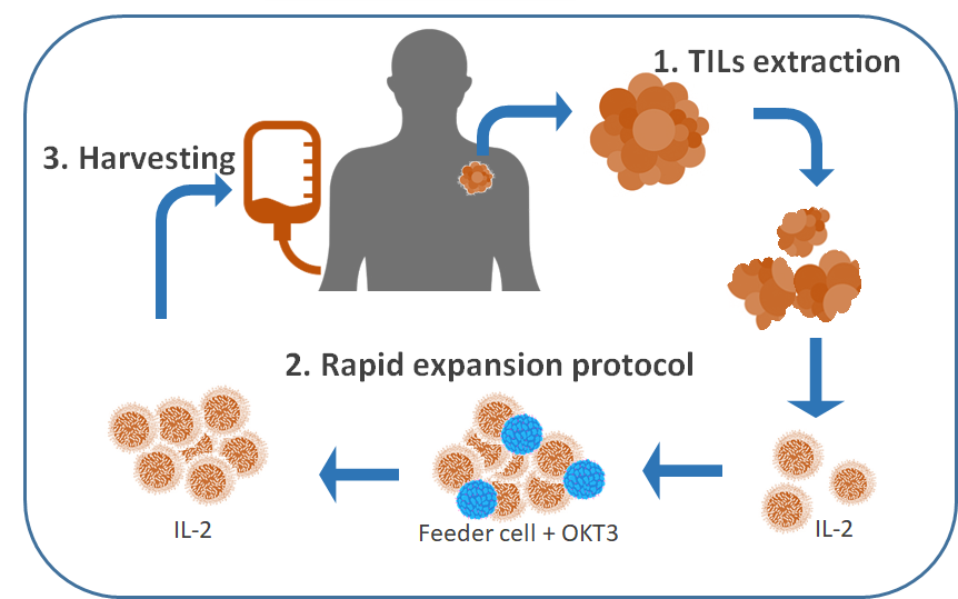 There are three main steps in ex vivo TIl expansion: 1. Extraction of TILs from a patient own tumour, 2. Rapid expansion protocol using high dose of IL-2 followed by activation by OKT3 expressing feeder cells, and expansion to billion numbers of TILs ex vivo, 3. Harvesting and preparation of ready to use expanded TILs in infusion bag to be re-infused back to a lymphocyte-depleted patient [7, 8, 10, 11]