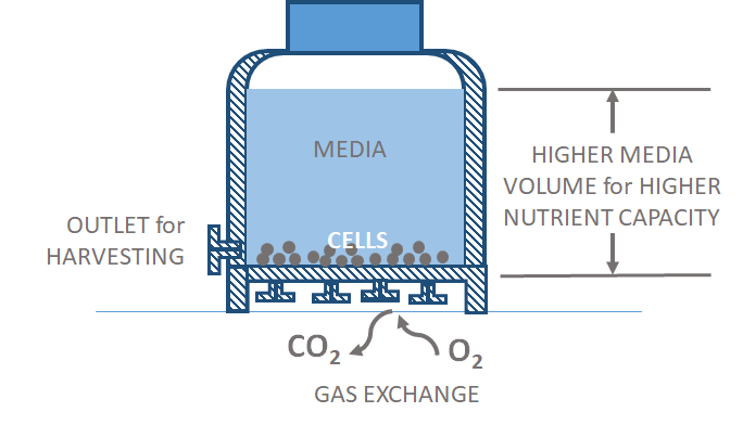 Basically, membrane bioreactor is a bioreactor that integrates a permeable-selective or semi-permeable membrane to allow growth of cells in suspension culture by providing active organic and/or gas exchange [16]. A typical membrane bioreactor, which was developed by Wilson Wolf Manufacturing, is named G-Rex flasks. It was designed to fulfil the requirement of highly expanded cells using larger medium volumes, particularly for TIL therapy platform. It consists of a common culture flask that is equipped with a silicone membrane, which is placed at the base of the flask; thus allowing efficient O2 and Co2 exchange (fig. 4) [14, 16]. Unlike a perfusion bioreactor that requires mechanical assistance to provide a rocking motion, a gas-permeable bioreactor is able to support a cell culture with a large media volume in a static environment without the need of a mechanical agitation. Once the optimal seeding density has been reached, the nutrients are not a limiting factor, and cells will remain viable during longer period of culture [14, 16].