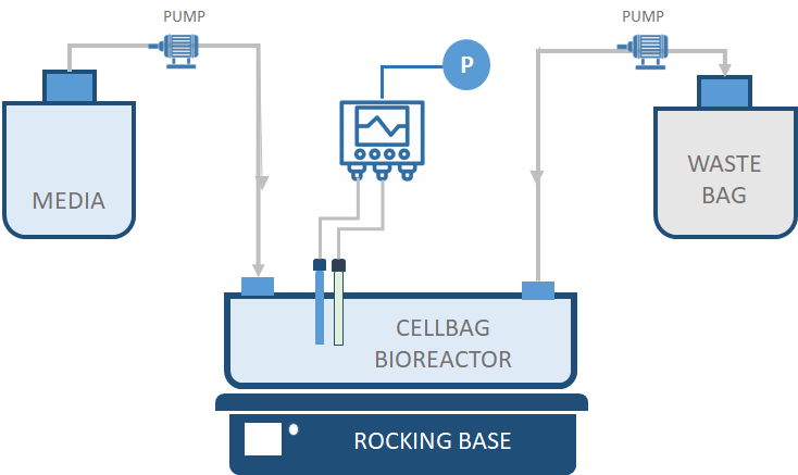 This scalable system consists of a cell bag bioreactor, pumps to perfuse fresh medium while discharging waste at the same time, a range of optional controllers, including sensory patches to monitor pH and temperature, and a rocking base [15, 20-22].