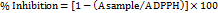Where, % Inhibition is the percentage capacity of the free radical inhibition, Asample is absorbance of the sample at 515 nm, and ADPPH is the absorbance of DPPH solution at 515 nm. Linear regression curve between % inhibition and sample concentration were made, the linear equation and IC50 were obtained [2].