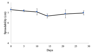 Fig. 3 indicates that the spreadability of serum gel containing AK leaf extracts did not change significantly after 28 d storage and remained within the acceptable range of 5-7 cm [12, 27].